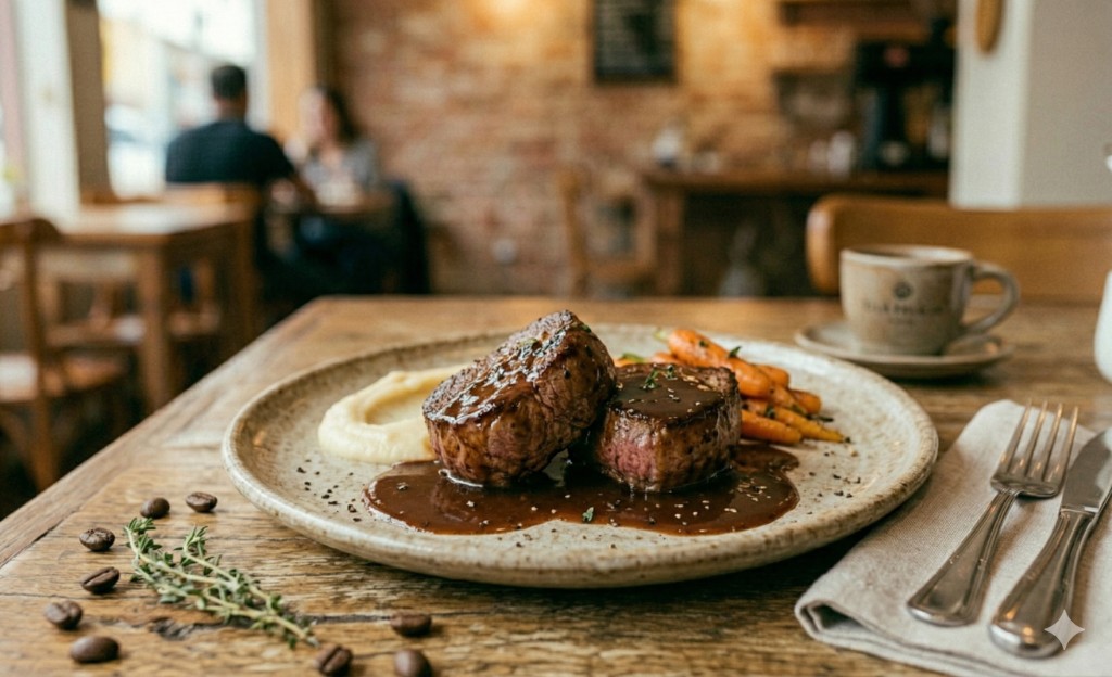 8. Montagem: Coloque os medalhões no prato de servir e despeje o molho de café generosamente por cima. Se houver suco da carne no prato de descanso, adicione-o ao molho antes de servir para potencializar o sabor.