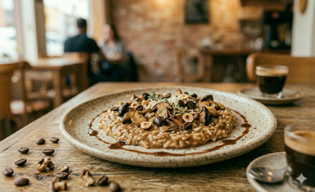7. Finalização e Serviço: Tampe a panela e deixe descansar por 2 minutos. Sirva imediatamente, decorando com os cogumelos reservados no topo e, se desejar, um fio mínimo de azeite trufado para complementar as notas terrosas do café.
